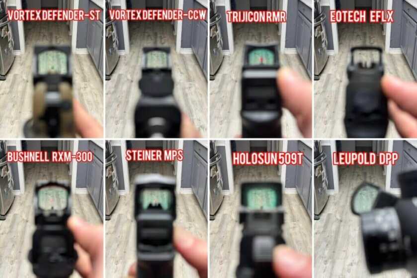 The window for the Defender-ST is noticeably larger than that of the Defender-CCW. It utilizes the DeltaPoint Pro footprint, which gives the body a larger overall size as well. The large hard coated aspherical lens offers a “distortion-free sight picture.” While the Defender-ST is lightyears better than a Trijicon RMR, it does have the slightest amount of refraction noticeable when moving the optic from side to side. In addition to this, the glass offers much truer colors with only a very faint blue tint. To help show how it compares to other optics on the market I made the image below. Pay no attention to the size of the optic as some were closer in the picture than others, the clarity is what I am aiming to show.