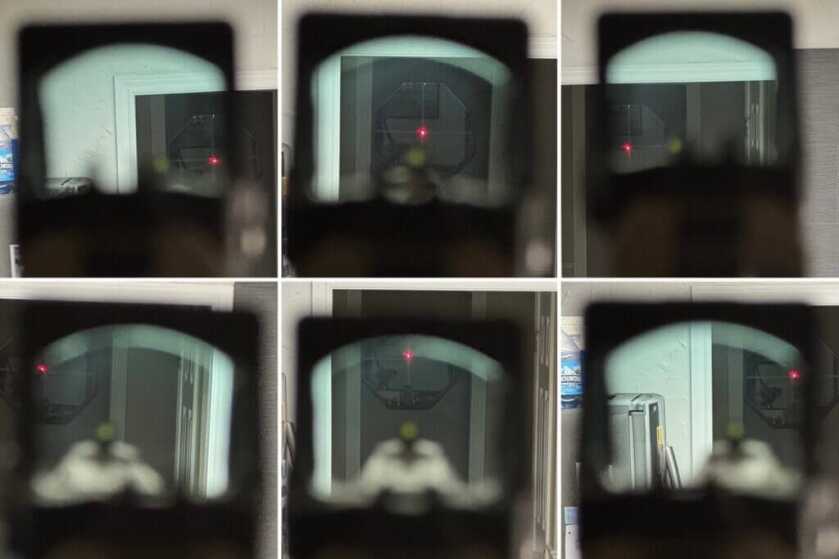 One thing I wanted to test with the Defender-ST is how well the dot shifted despite where the user had the dot placed in the window. Some red dots can have a large POI shift (a foot or so at 20 yards) when the dot is zeroed when shot at the bottom of the window but then used at the top. However, the Defender-ST proved to track great. I set it up in a tripod aiming at an intersection point in my window, and took pictures from different angles. Each picture shows the dot still aiming at the same point which is a great accomplishment.