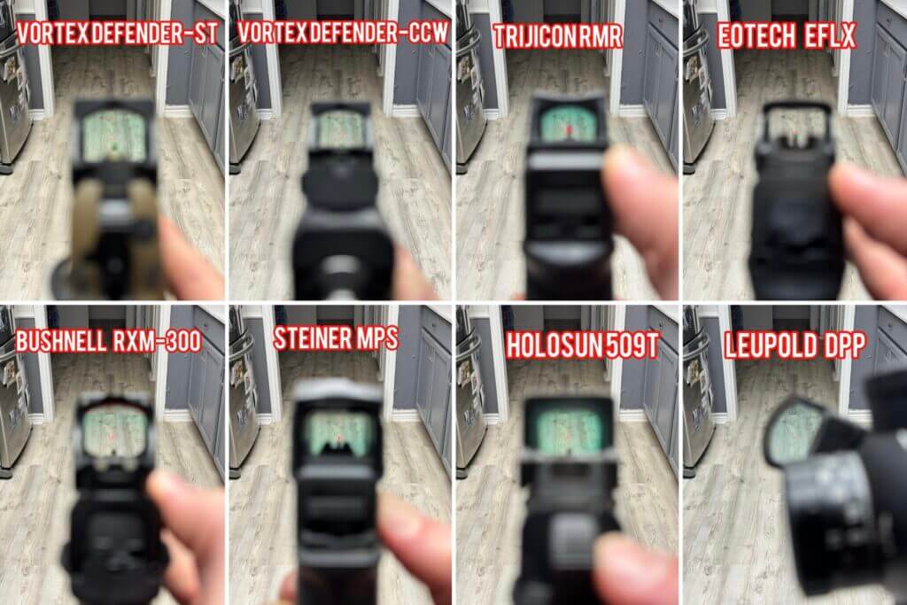 The window for the Defender-ST is noticeably larger than that of the Defender-CCW. It utilizes the DeltaPoint Pro footprint, which gives the body a larger overall size as well. The large hard coated aspherical lens offers a “distortion-free sight picture.” While the Defender-ST is lightyears better than a Trijicon RMR, it does have the slightest amount of refraction noticeable when moving the optic from side to side. In addition to this, the glass offers much truer colors with only a very faint blue tint. To help show how it compares to other optics on the market I made the image below. Pay no attention to the size of the optic as some were closer in the picture than others, the clarity is what I am aiming to show.
