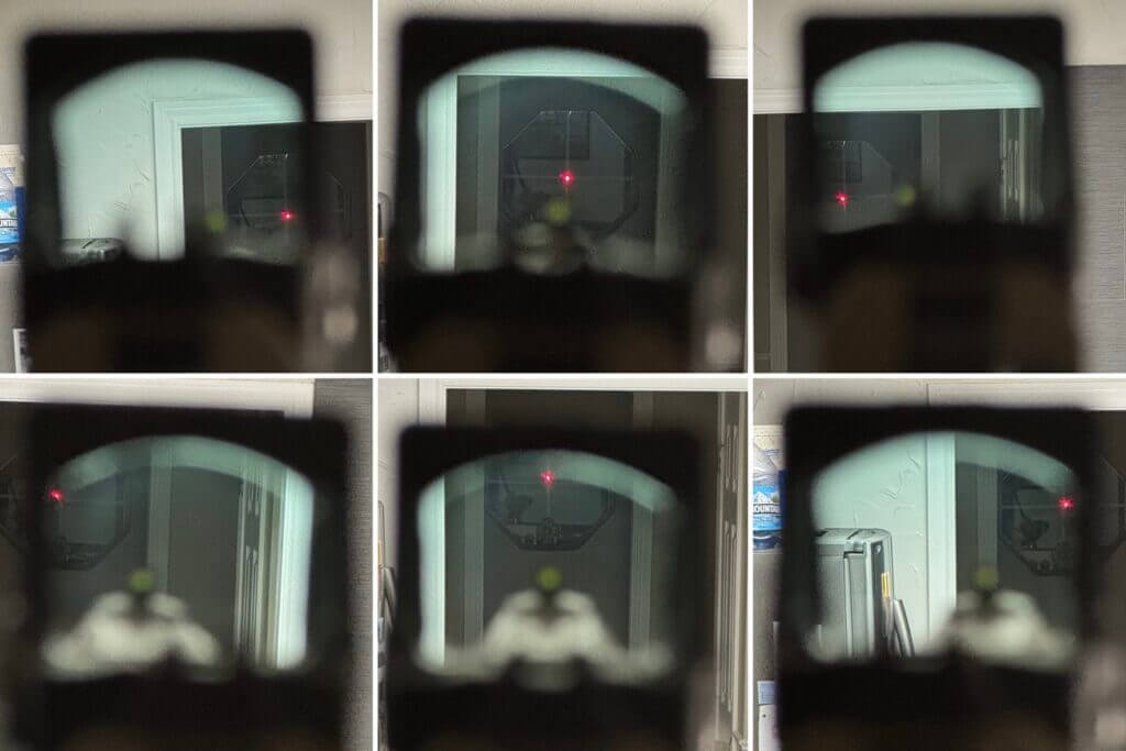 One thing I wanted to test with the Defender-ST is how well the dot shifted despite where the user had the dot placed in the window. Some red dots can have a large POI shift (a foot or so at 20 yards) when the dot is zeroed when shot at the bottom of the window but then used at the top. However, the Defender-ST proved to track great. I set it up in a tripod aiming at an intersection point in my window, and took pictures from different angles. Each picture shows the dot still aiming at the same point which is a great accomplishment.
