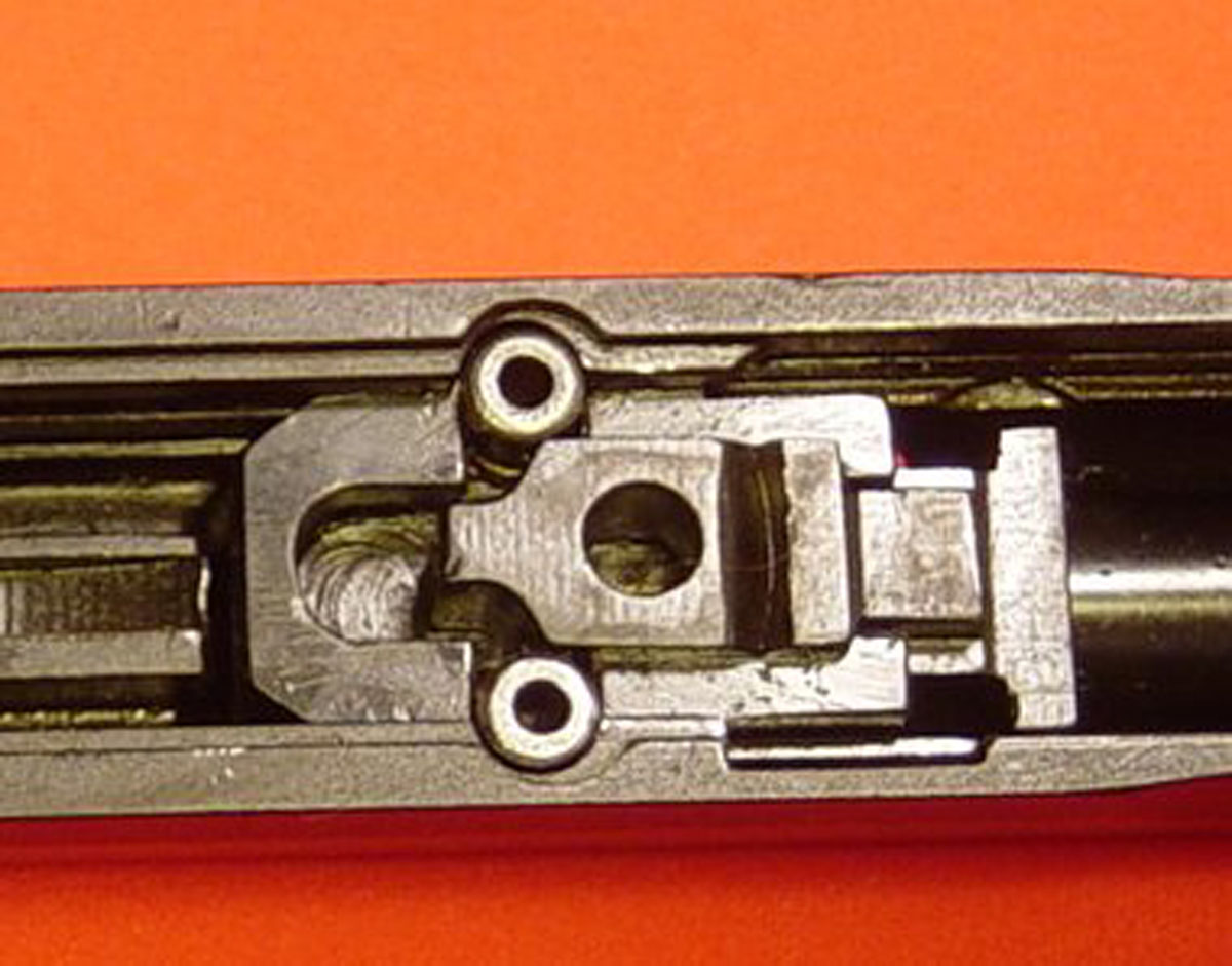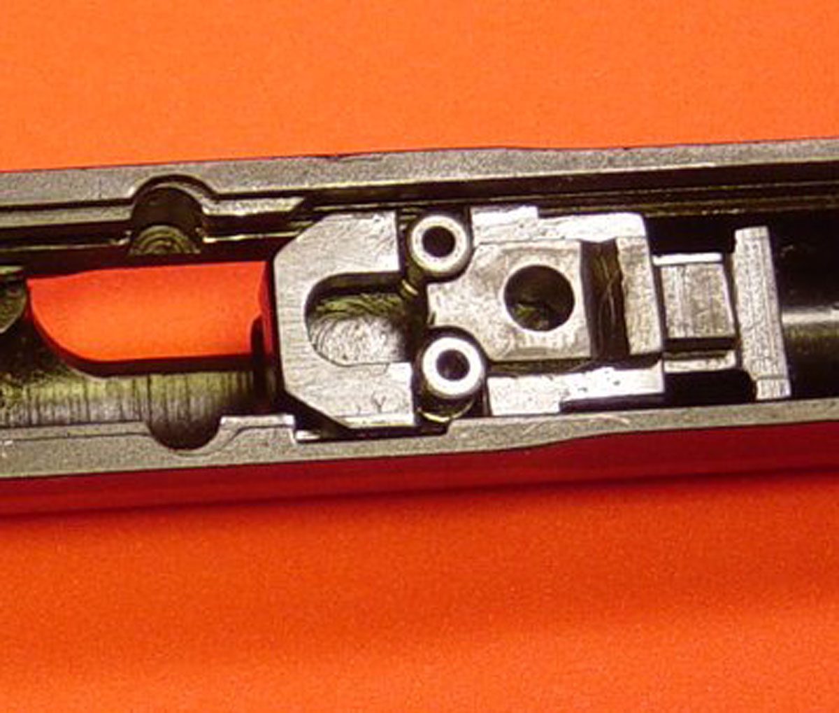 The truly remarkable bit about the vz52 design is obviously the roller locked action. These rollers perform a similar service as do the same components on an MP5. The slide locks to the rear on the last round fired, but there is no manual slide release. To reload the gun one exchanges magazines and then gives the slide a brief tug to the rear before releasing it to go forward on a fresh round.