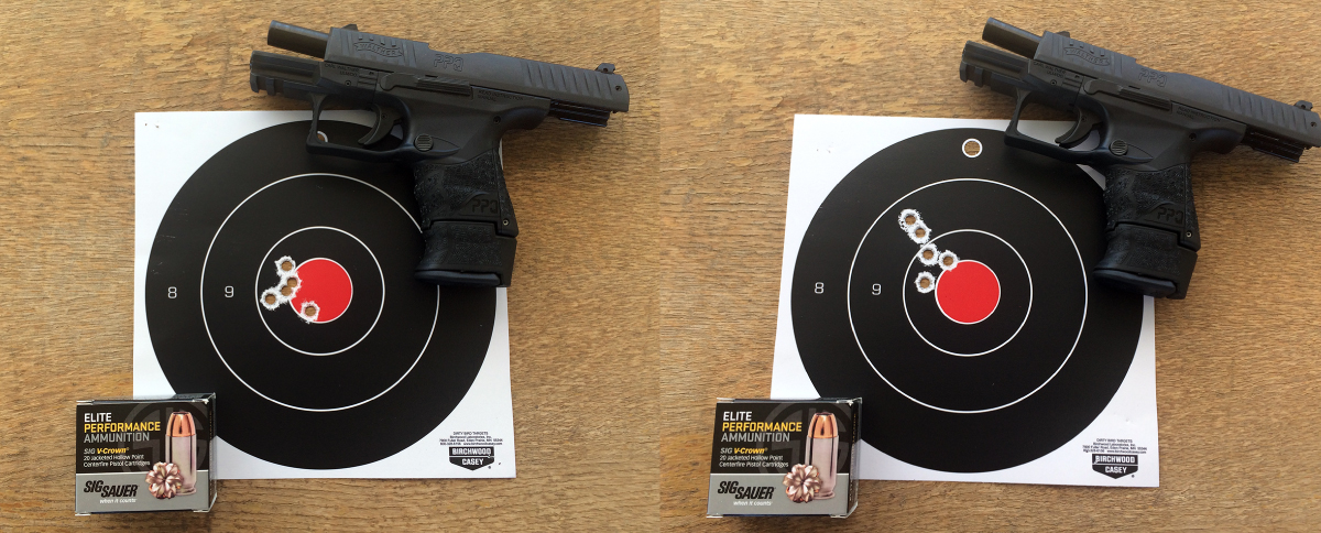Next, I tested for accuracy from 7 and 15 yards with two different loads from both Hornady and Sig Sauer. You can judge for yourself, but I found the results to be more than acceptable for a sub-compact semi-auto. I’ve included the ammunition details in the caption of each image.