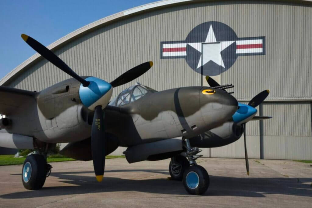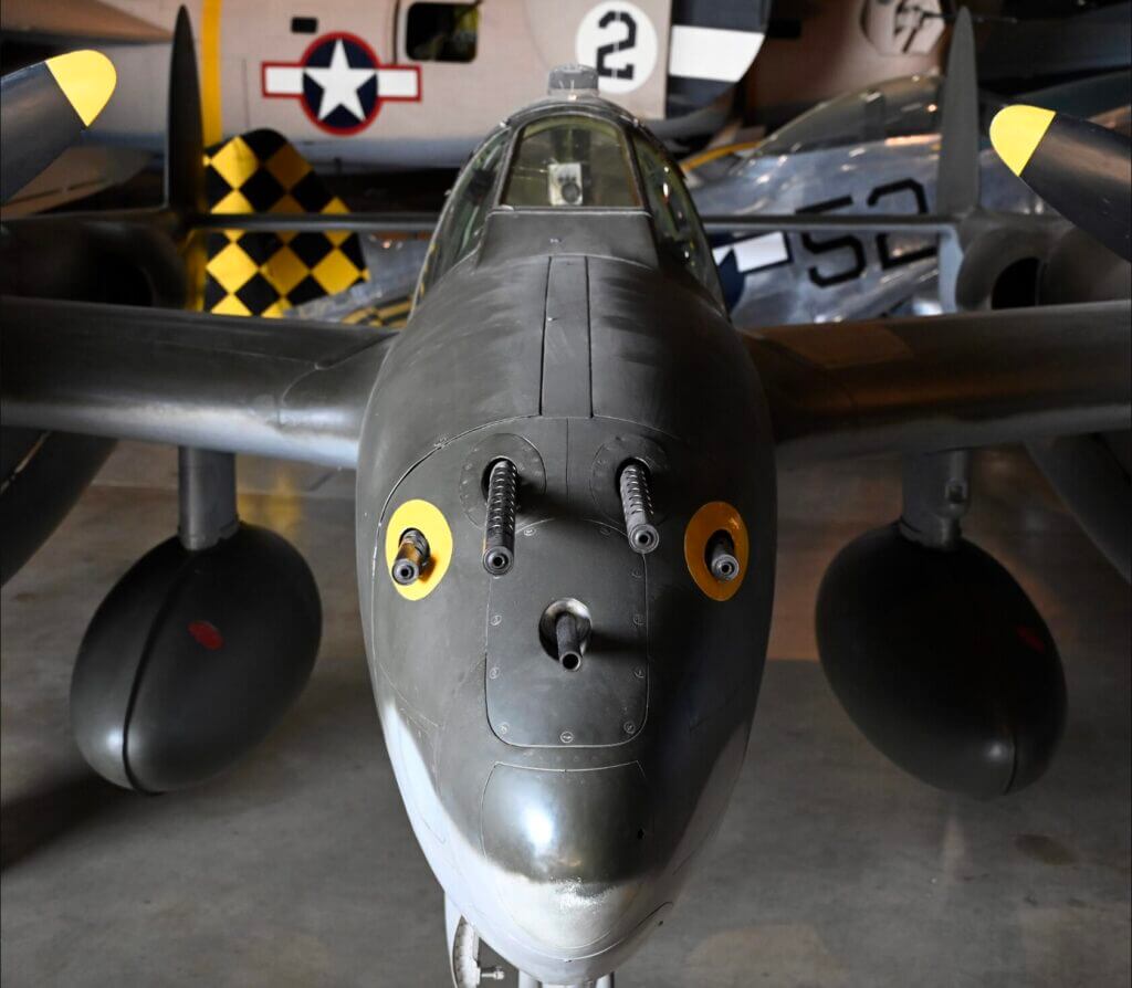 The big twin-engine P38 fighter represented the state-of-the-art in armed interceptors at the outset of WW2. By 1944, however, the Fork-Tailed Devil, as the Germans referred to it, was badly outclassed by more nimble single-engine types. As a result, Lightnings were often used for ground attack missions. The concentrated firepower of four M2 .50-caliber machineguns all clustered together alongside a single Hispano 20mm cannon in the nose was devastating against terrestrial targets like tanks, trains, and trucks.