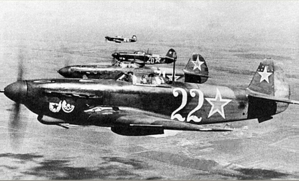 The Yak pilots formed up low over the city and attacked the Lightnings from below. One P38 exploded in flames. The American pilots then began shooting back, red stars or not. Around that time, a further group of Soviet fighters showed up to join the fray.