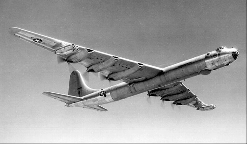 No kidding, this thing was a monster of a warplane. Maximum takeoff weight was an eye-popping 410,000 pounds. The machine was powered by a combination of six Pratt and Whitney R-4630-53 Wasp 28-cylinder radial pusher engines as well as four GE J47 turbojets. The big plane carried a combat crew of thirteen and had a maximum speed of 435 miles per hour.