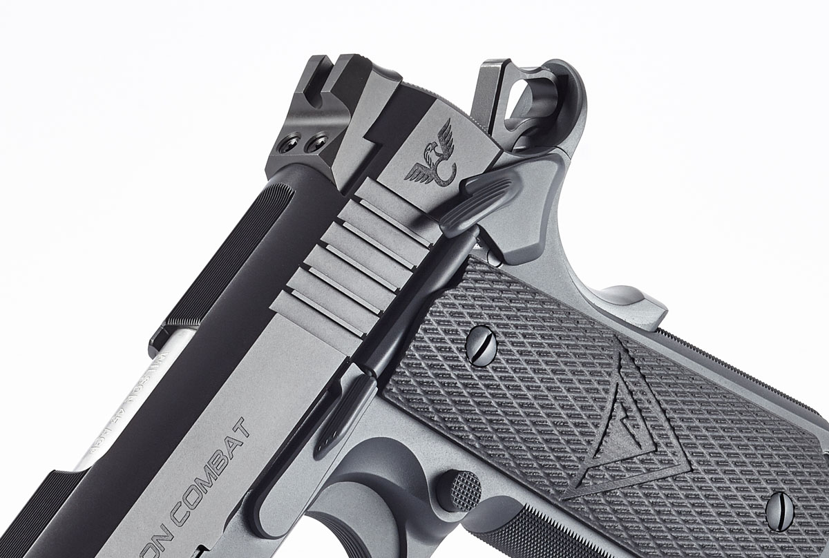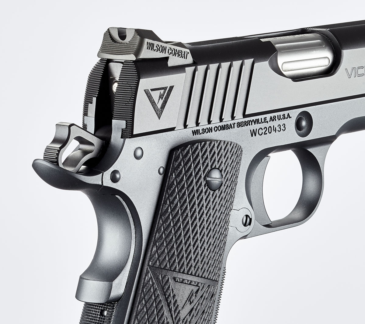 The slide is equipped with Wilson’s “U” notch Battlesight and a gold bead front sight. Ball end mill cuts, serrations, and unique cocking serrations are standard on this model.