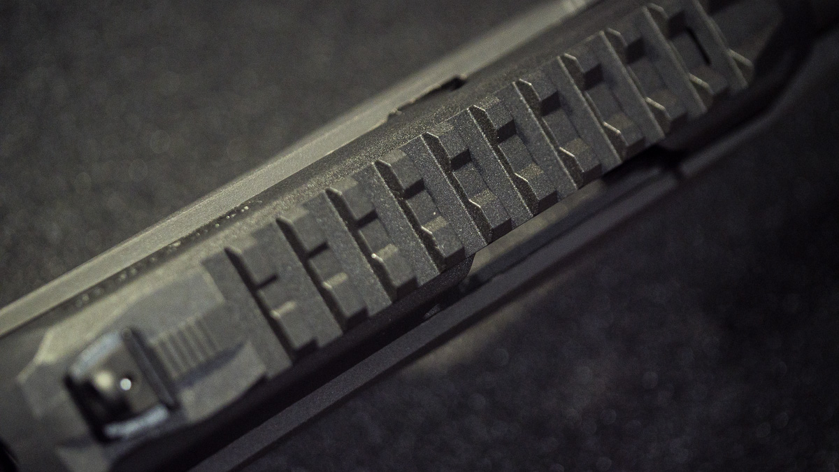 - There’s a sling hole and Picatinny rail under cover at the tip of the forend.