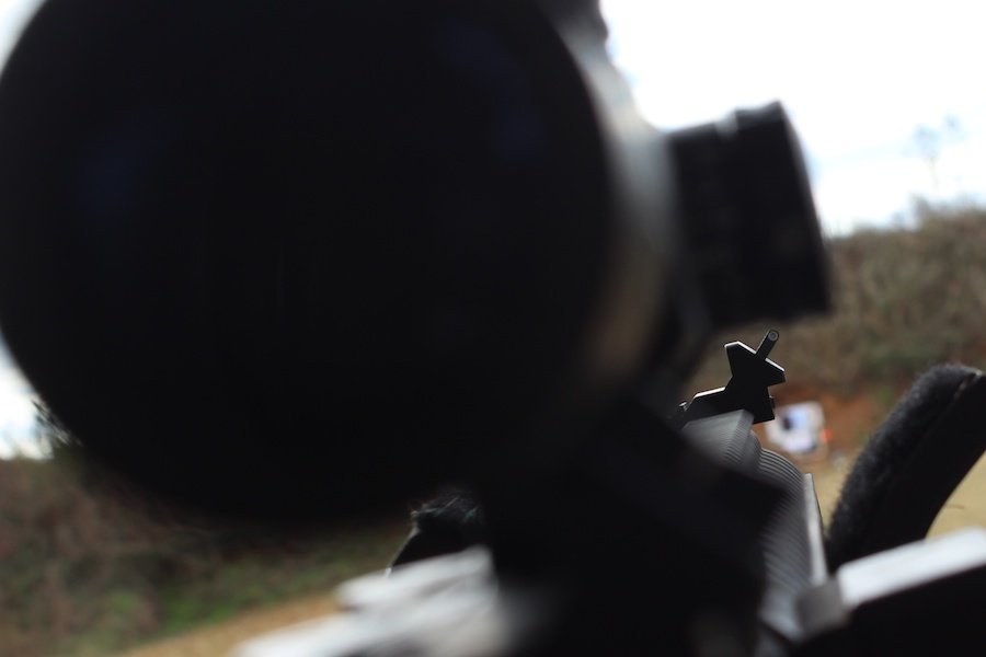 The rear sight tucks neatly beneath a scope. It is adjustable and can be secured in place with Loctite and a set screw. Don’t neglect this step, or, like me, you will have to spend valuable time looking for the rear blade when it falls off.