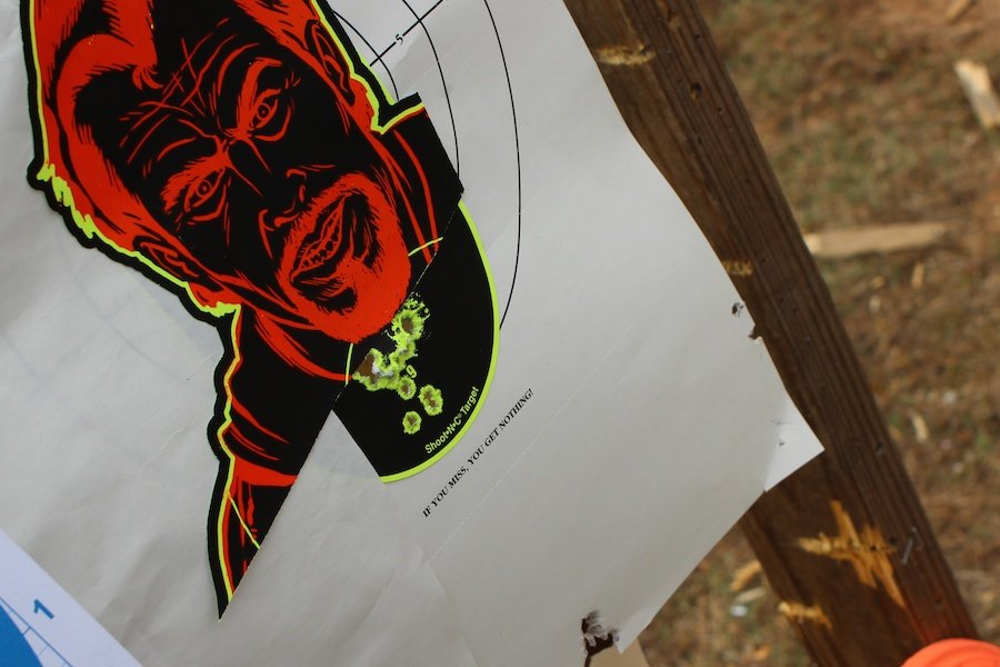 This is 20 rounds from the CMMG .308 aimed at the bad-guy head. Though we’re hitting low, the shots are still effective. And this is with no sight adjustment.