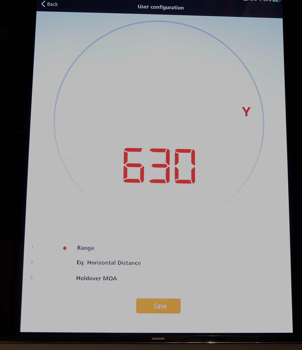 The user decides what three pieces of data will be displayed. Range, Equivalent horizontal distance (shoot to), and MOA holdover have been selected.