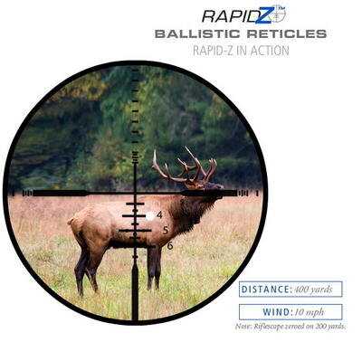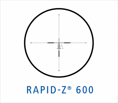 The Rapid-Z 600 is set up for a 200 yard zero. In order to have room to use pure holdover up to 600 yards, the 100 yard line is actually above the center of the crosshairs, and because it is only about an inch to an inch and a half higher for most hunting calibers, there is no “holdunder” line. You can estimate it on the target. The center of the crosshairs is 200, and the lines under it go to 600 for holdovers. If you look in the actual graphic here of the calculator, the actual distance calculations for the lines in the reticle aren’t perfectly these values, 302 for 300, 399 for 400, but they are pretty darn close, close enough to take home your elk.