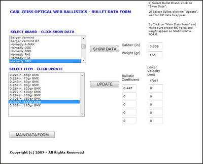 The calculator looks complicated when you first go in (you do have to provide your email and zip code to log into it), but once you hang around in there for a bit, the entire system becomes painfully simple, and you will find yourself slapping your forehead asking “why didn’t I invent that?” Start from the main data screen and you click either “Obtain Factory Ammo Data” or “Obtain Bullet Reloading Data.”