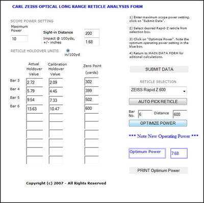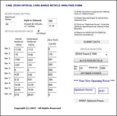 Once your basic data is in, you click the link that says “Reticle Analysis Form.” This is the meat of the application. On that page, choose your Rapid-Z reticle. They come in 600, 800, and 1000 yard configurations, and a special Varmint version. Adjust your top power on the scope on your actual model. On the Zeiss Victory FL with the Rapid-Z 1000 test scope this is 24 power. With the Zeiss Conquest Rapid-Z 600 this is 10 power. Make sure your sight in distance is at the center crosshair distance on your reticle choice (look at the pictures), then click “Optimize Power.”