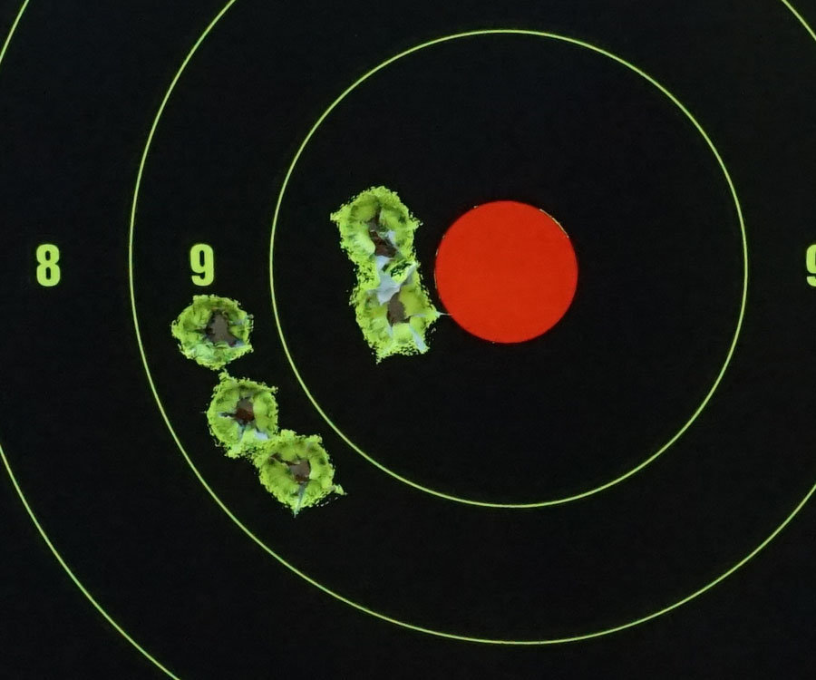 I shot a .75″ group from 10 yards.  1.5″ from 25 yards. The iron sights are designed for speed, not precision, so the addition of a red dot optic allowed for tighter groups. But the gun points well, and slapping rounds on target is easy, even from the hip.