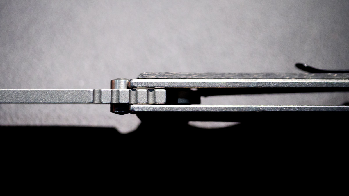 Glow-in-the-dark fibers are interwoven with the carbon fiber and it glows green–I guess you’ll be able to see your knife easier when you come into a dark house on a sunny day, and maybe pick it out on the nightstand a little easier, too. The glow in the dark is just a fun quirk on a very functional knife. You can also change out the hardware with Hinderer custom pieces.