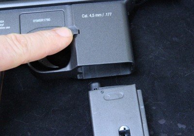 This Model 712 has an 18 round magazine and shoots only .177 cal BBs (There is a separate revolver line that shoots lead pellets through a rifled barrel). Loading the magazine is slightly agonizing when you shoot full auto because the BBs have to be loaded one at a time, but other than that I have no real complaints on the gun. The only quirk was that the full auto switch has to be pressed in hard to change the gun from full auto to semi and back again. Full auto you get about 3 mags per air cylinder, but I’m sure if you are careful you could probably get a couple more. The blowback operation doesn’t require a BB in the chamber, so you have to let off the trigger when the mag is empty, which is tricky to do because the rate of fire is pretty fast.