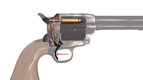 The Cattleman II’s internal safety mechanism disengages the firing pin when the gun is not cocked, thus allowing it to float free in the hammer. Cutaway images courtesy of Uberti.
