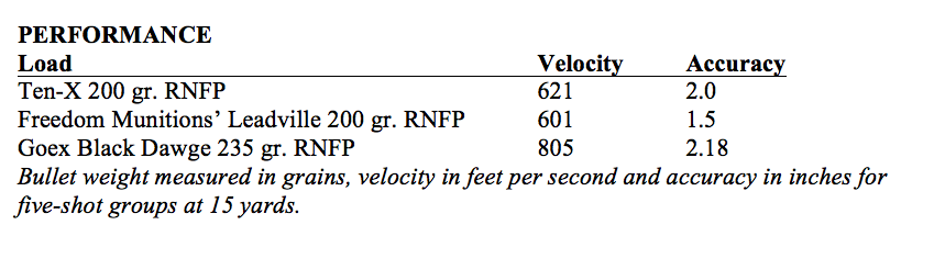 Calibers: .45 Colt (tested), .44-40 WCF and .38/.357 Magnum