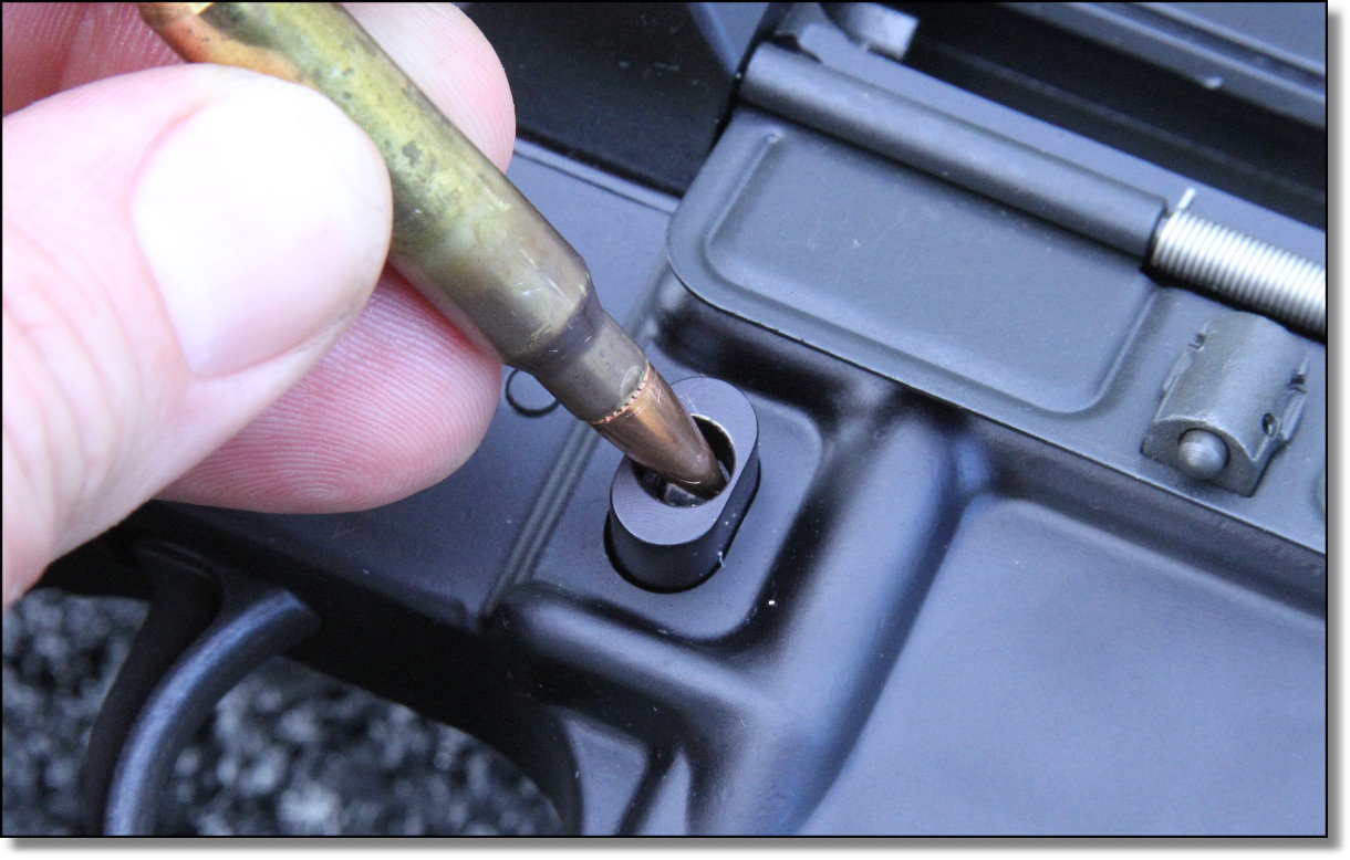 You would think that by now, in light of the Heller and McDonald decisions, a few feisty Californians would have the gumption to get some of the more ludicrous of their laws overturned, but it hasn’t happened. These days you can get an AR into California but it has to have a few limitations. One is the magazine of course. You are limited to 10 rounders. And you also have to have what is called a “bullet button” installed on the gun. This is a magazine release that has to be depressed by inserting a bullet, key, or other tool into a hole in order to release the magazine. You also have to pin folding stocks, but that doesn’t apply to this gun.