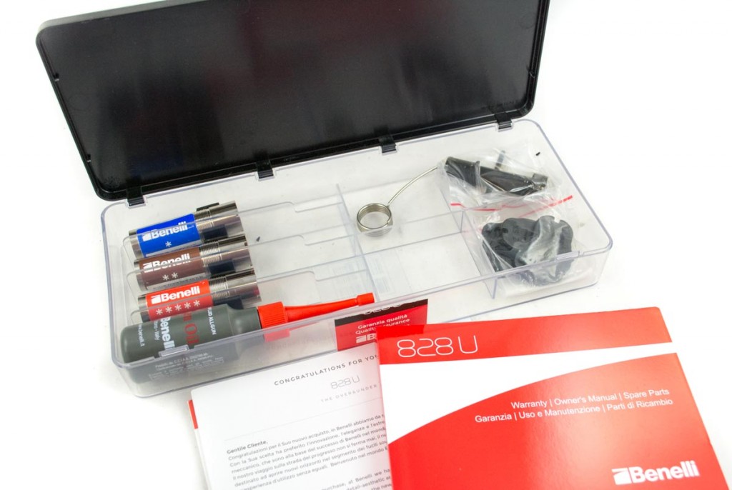The plastic box inside of the hard case includes extra choke tubes, gun oil, choke wrench, shims, and documentation.