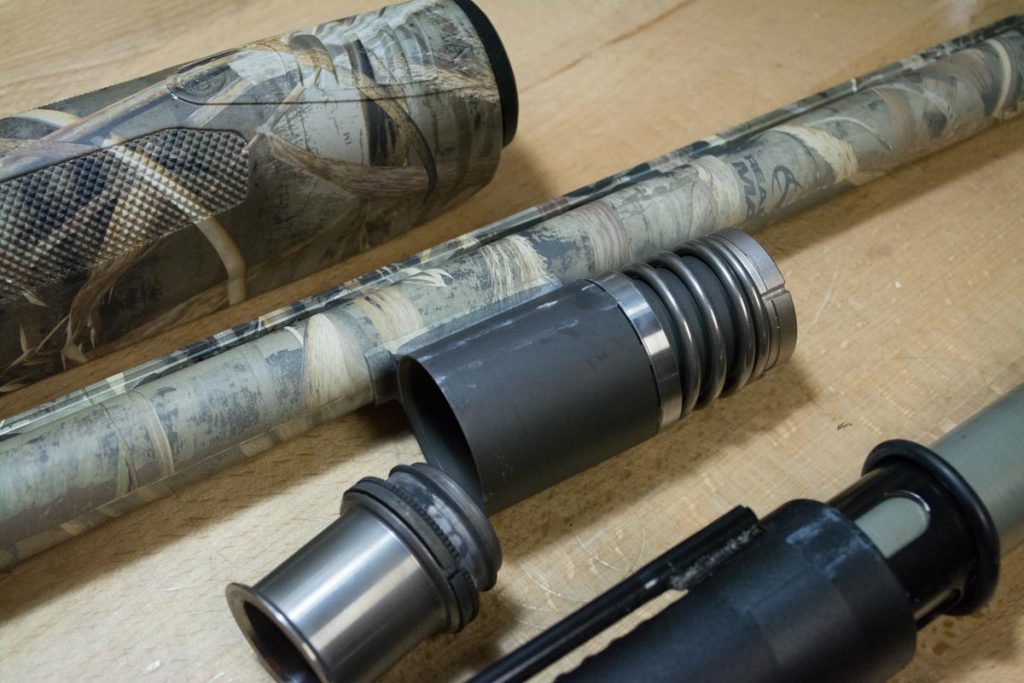 The gas system is self-exhausting and self-cleaning. It has a vent system that you can see just behind the magazine tube cap. The idea is similar to that of a release valve on a water heater or pressure cooker. When there’s a ton of gas pressure, more than required to reliably cycle the action, the excess is automatically vented off through these ports. That’s what allows this shotgun to handle (without any manual adjustment) everything from one-ounce loads all the way to 3.5-inch howitzer shells.