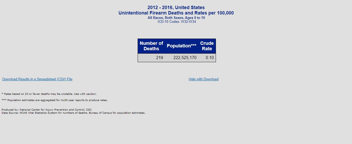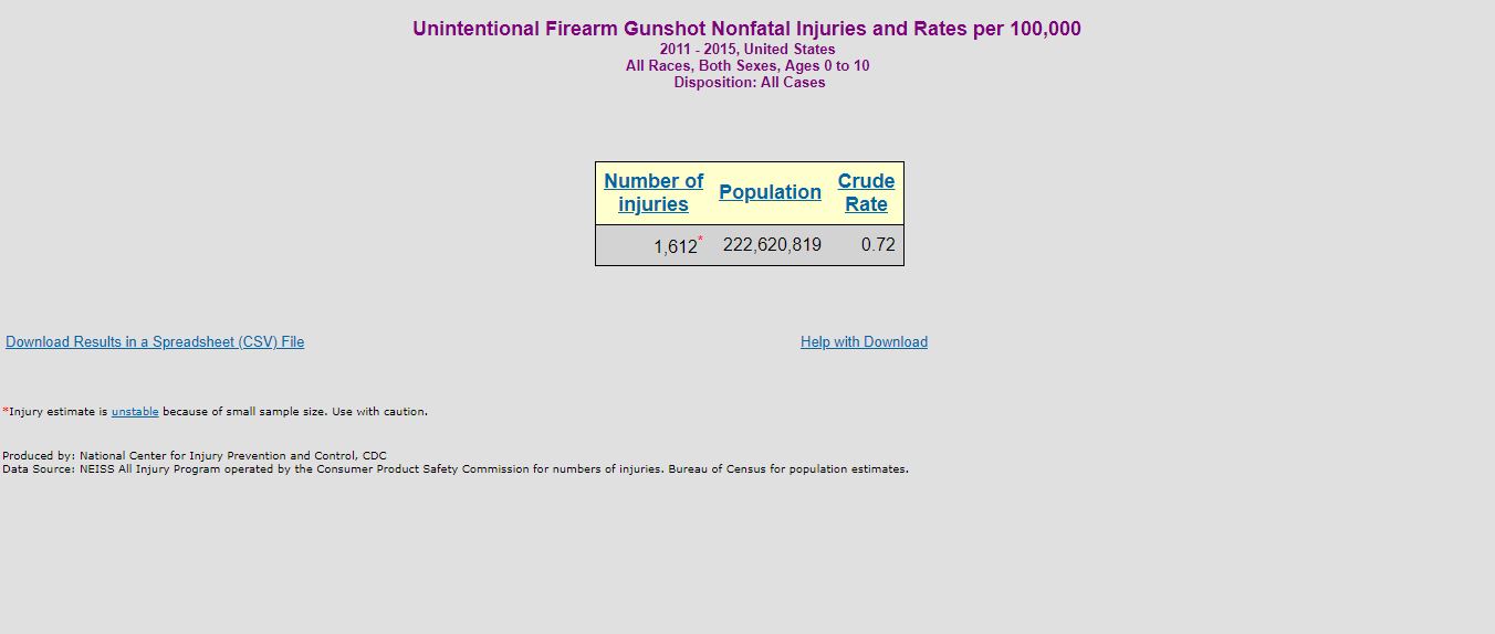 The reporting system is easy to use. In our analysis, we filtered the data by intent or manner of injury (unintentional), cause or mechanism of injury (firearm), years reported (2011-2015 non-fatal, 2012-2016 fatal), and age range (>1-17). We’ve posted screen shots below.