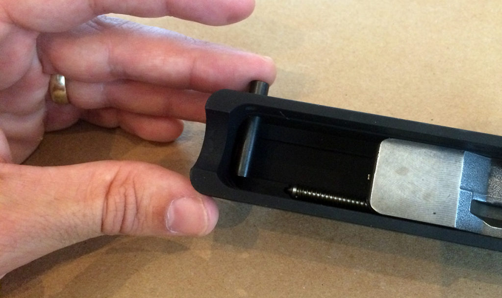 Place the barrel into the receiver’s barrel opening and make sure it fits flush to the receiver. Also ensure the extractor fits into the corresponding notch in the barrel.