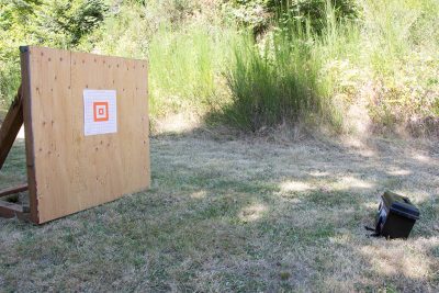 To set up the Bullseye AmmoCam target camera you just place the camera unitbetween 8 and 15 feet back from the target. This puts it at a safe distance from the target, minimizing the risk damage from gunshots or ricochets. The AmmoCam has a built-in stand that you can use to position the camera and angle it to the right height to see just about any kind of target.