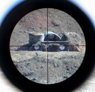 Burris C4Plus Wind MOA Reticle – This is a through the scope shot looking down range at Independence Range’s 300 yard steel targets. I would not judge the image quality of the Burris scopes based on this picture but the edge to edge clarity was very good. The reticle also contrasted well with the background making it and the hash marks easy to pick up and index on target. In this case, the picture imitates holding 1 MOA right on the center target to compensate for a stiff right to left wind.