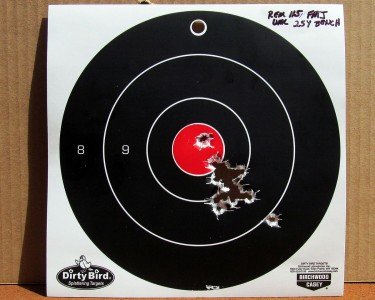 Shooting from the bench with a laser sight, this 15 round 25 yard group provides a good look at the accuracy potential of the pistol.