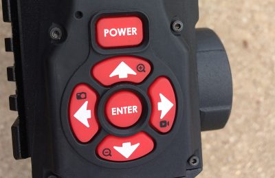 Shooters control the menu and power using six buttons located on top of the scope. The arrow keys double to zoom the scope in and out and to capture still and moving images.