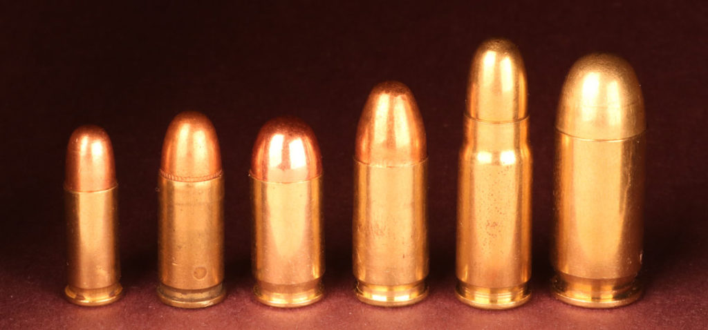From left to right, the .25ACP, .32ACP, .380ACP, 9mm Parabellum, Russian 7.62x25mm, and American .45ACP. Note that the German cartridges pale alongside the American .45. The bullet fired by the .45ACP was fully twice the weight of that launched by the 9mm.