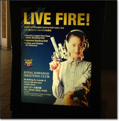 I recently visited the Islands of Hawaii, putting some of my hard earned vacation dollars to work. While there, I noticed something unusual in the Royal Hawaiian Shopping Center in downtown Waikiki. It was a billboard ad for a shooting range, of all things, where tourists could rent guns and shoot!