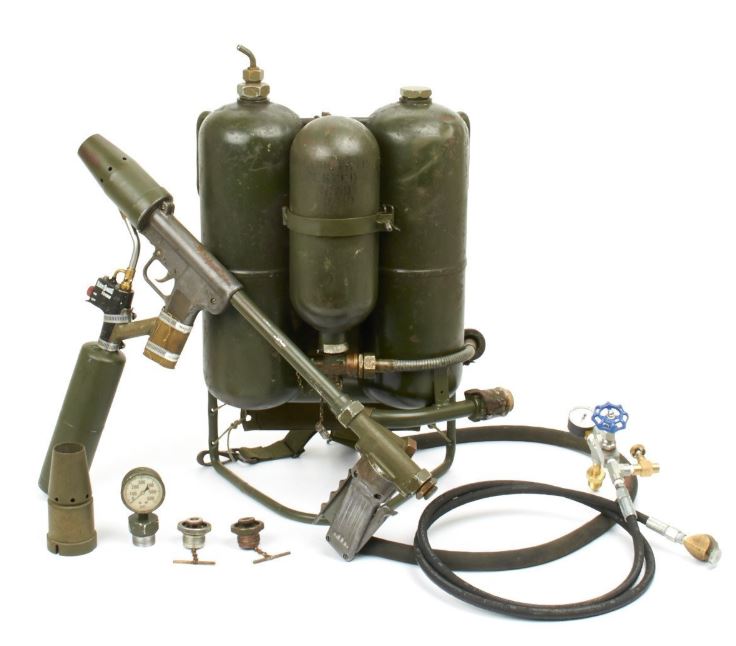 A flamethrower is a device that shoots pressurized fuel ignited by a pilot flame. They were first used in WWI to flush people out of trenches. During WWII the United States Army used the M-1 and M-2 flamethrowers for clearing bunkers and machine gun nests. Flamethrowers in the United States are completely unregulated and legal to own in every state, except California and Maryland (I’m not an attorney so don’t quote me on that. But that’s my understanding of the law).
