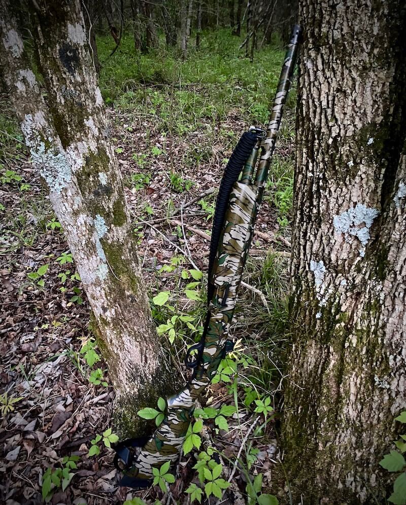 The Mossberg is covered in Mossy Oak- Greenleaf camo which blends perfectly with the surroundings in the southern woods. It is exactly what a turkey gun should look like to keep you hidden while calling in a big bird.