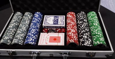 This set hs 300 chips, two decks of cards, 4 dice and a dealer chip, though I have no idea what the hell you need a dealer chip for.