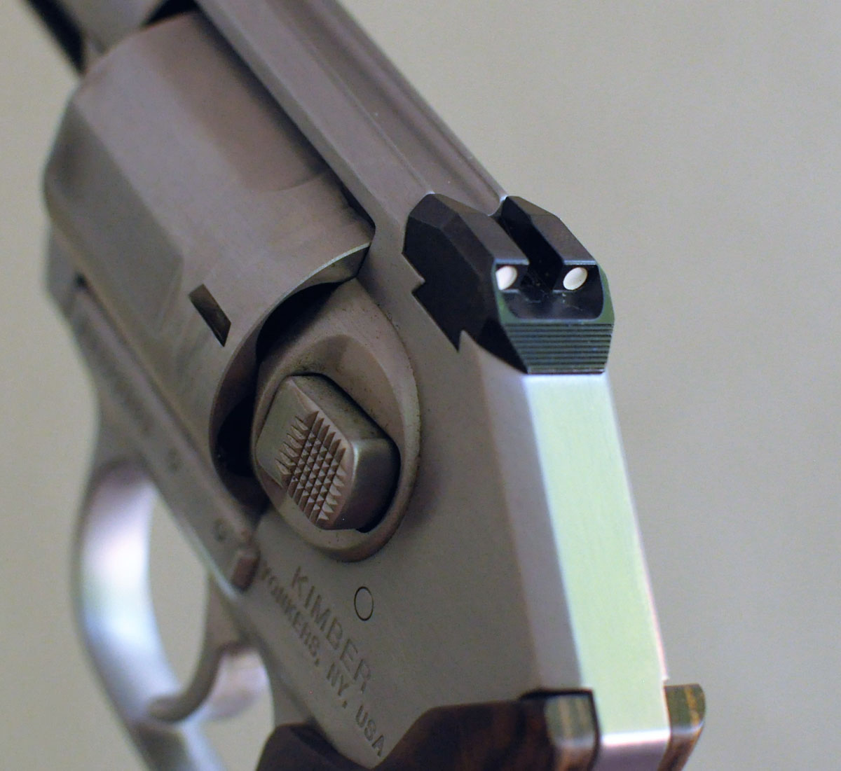 The back strap on the Kimber is serrated to provide resistance to horizontal movement during firing.