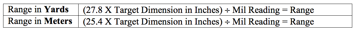 Mil relation charts are an excellent way to get a range quickly if time is a factor. I keep this one in my data book at all times.