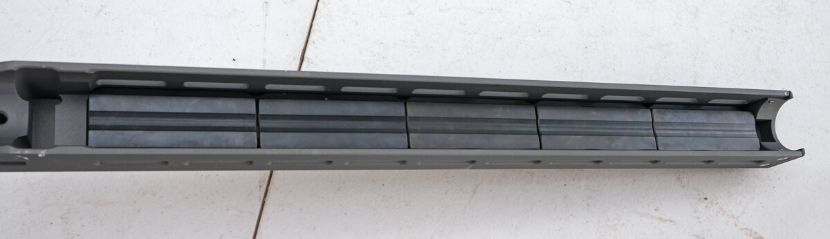 The first set of steel weights can be installed below the barrel in a channel in the forend.