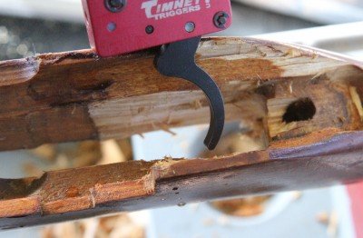 That is why you shouldn’t even think twice about “defacing” your “original” stock by putting a Timney trigger in it. I strongly suggest having a gunsmith with a proper milling machine make the cutout for you. I tried to do it with a chisel and it was a mess, as you can see in the picture. I find that Dremel tools tend to walk on me, unless they are clamped down and the material is clamped down, but if you forgo the milling machine a Dremel would probably be a better option than the chisel. The chisel was brand new and sharp, but tended to bang pieces out of the bottom of the stock, which looks really bad.