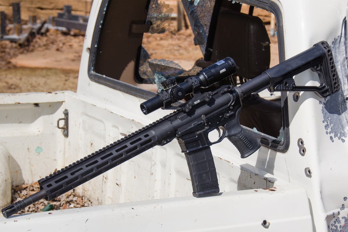 My sample rifle came with an Elite Tactical SMRS (Short Midrange Rifle 1-6.5x24mm) from Bushnell, mounted on a Weaver mount. This second focal plane scope is a great choice for any .223 rifle, with the 1-6X magnification working from close-up all the way out to the effective distance of the bullet. The folding ThrowDown PCL (power change lever) makes quick magnification changes easy. The mil-based illuminated BTR-2 reticle is fast and intuitive, and gives the shooter holdovers. The T-Lok locking target turrets allow secure, repeatable adjustments with simple and robust knobs. This is not included with the rifle out of the box, but makes a great addition.