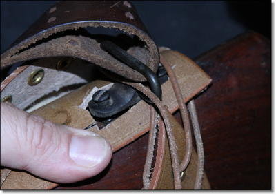 | The nut with the two wings on it goes upside down, up into the back of the mount. Use one of the shorter thick screws to secure it to the mount, and the wings go down into the back of the action, matching up with the action pieces so it doesn’t stick out. You’ll see how it goes when you go to put it in. One of the wings here is hanging out just to illustrate. Note that the end hook is not screwed down yet. | |