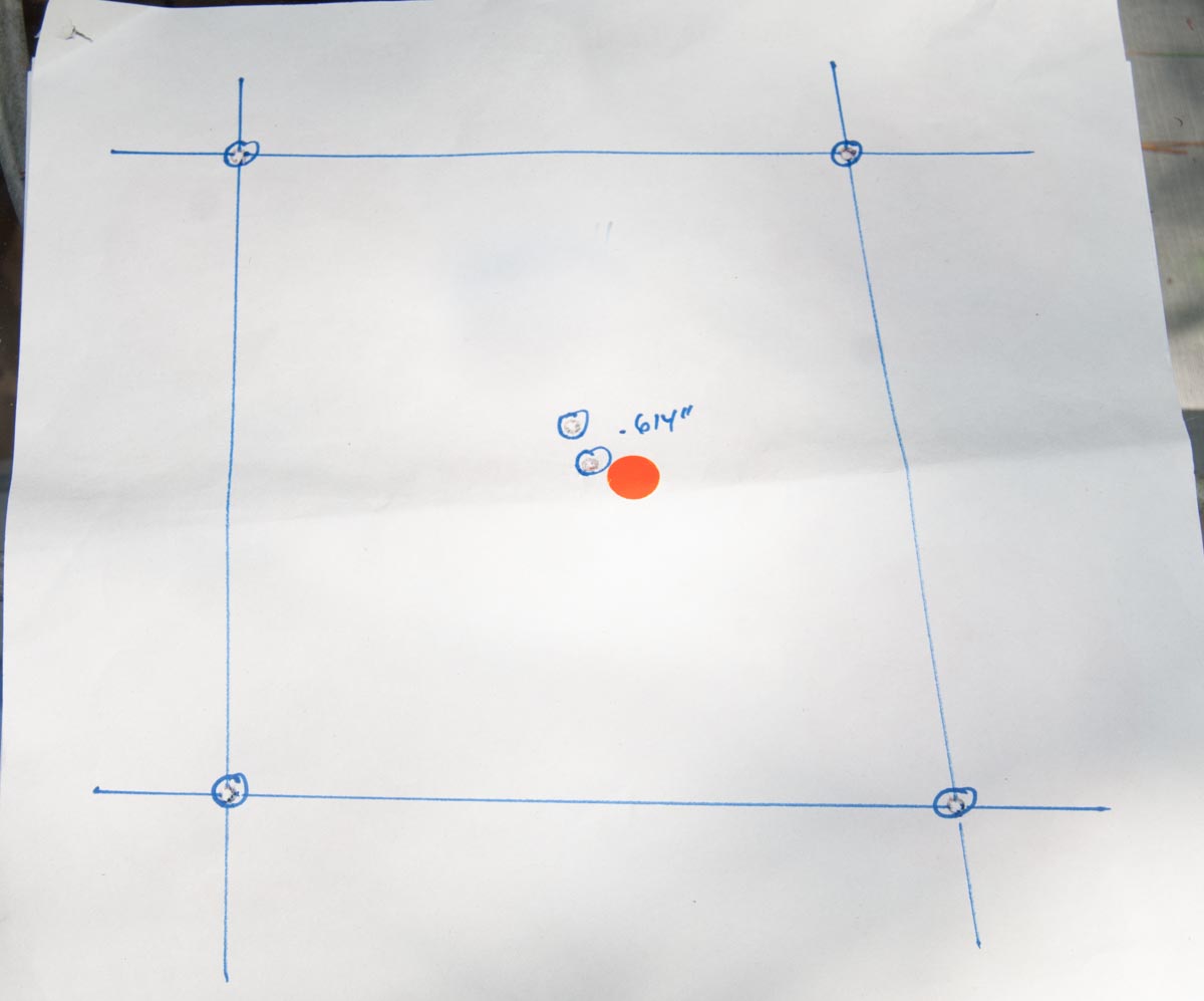 Here’s a fancy version of “shooting the box.” In this case, I started in the middle, then used scope adjustments to define the four corners. The last shot was back to zero settings. As you can see, this scope came back to it’s original zero pretty well.