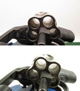 A before and after look at a revolver cylinder. All loose debris was removed with one pass of the RIPCORD.