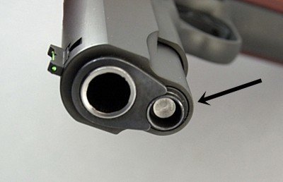 This is an example of a 1911 with a short guide rod. Because the guide rod does not protrude from the slide when operated, the recoil plug is topped with a cap.
