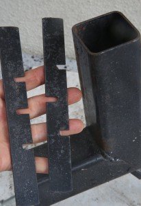 All rocket stoves need a baffle of some kind to give the bottom of the fire oxygen. This stove uses a bent piece of galvanized steel. It is the only part that you might want two of, because eventually it would theoretically rust and thin. Er, prob not.