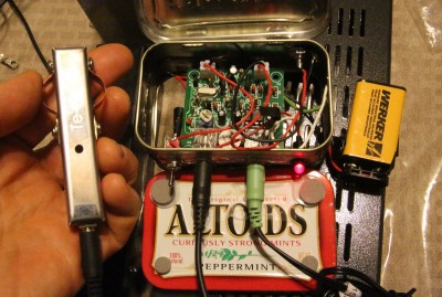 The classic QRP radio in the Ham world is built into an Altoids tin. Out of curiosity I bought this one on Ebay because it came with a mini antenna tuner, and inside I found the “other” Pixie board on Ebay, the one that doesn’t have the 5.5mm jack installed in it. This guy taped together two Altoids tins so he’d have room for the battery, and for some reason put an RCA plug for the antenna. But it works! The keyer in my hand is the Te-Ne-Ke portable iambic keyer linked above. This Pixie doesn’t support the stereo cord dit/dah either.