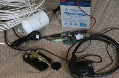 CW is Morse code, and it is very narrow, as narrow as 150 hertz. That makes for a very efficient broadcast at low power, because all of the radio’s power is directed to a very thin signal traveling as far as possible. These radios broadcast and receive only Morse code at 7.023 mhz. They use the most simple circuits possible, and they run on 12 volts, which can be directly from your car battery with your engine off. You will need a specific antenna for the “40 meter” Ham band, but they can be had for fairly cheap. The radios themselves are as little as $5.