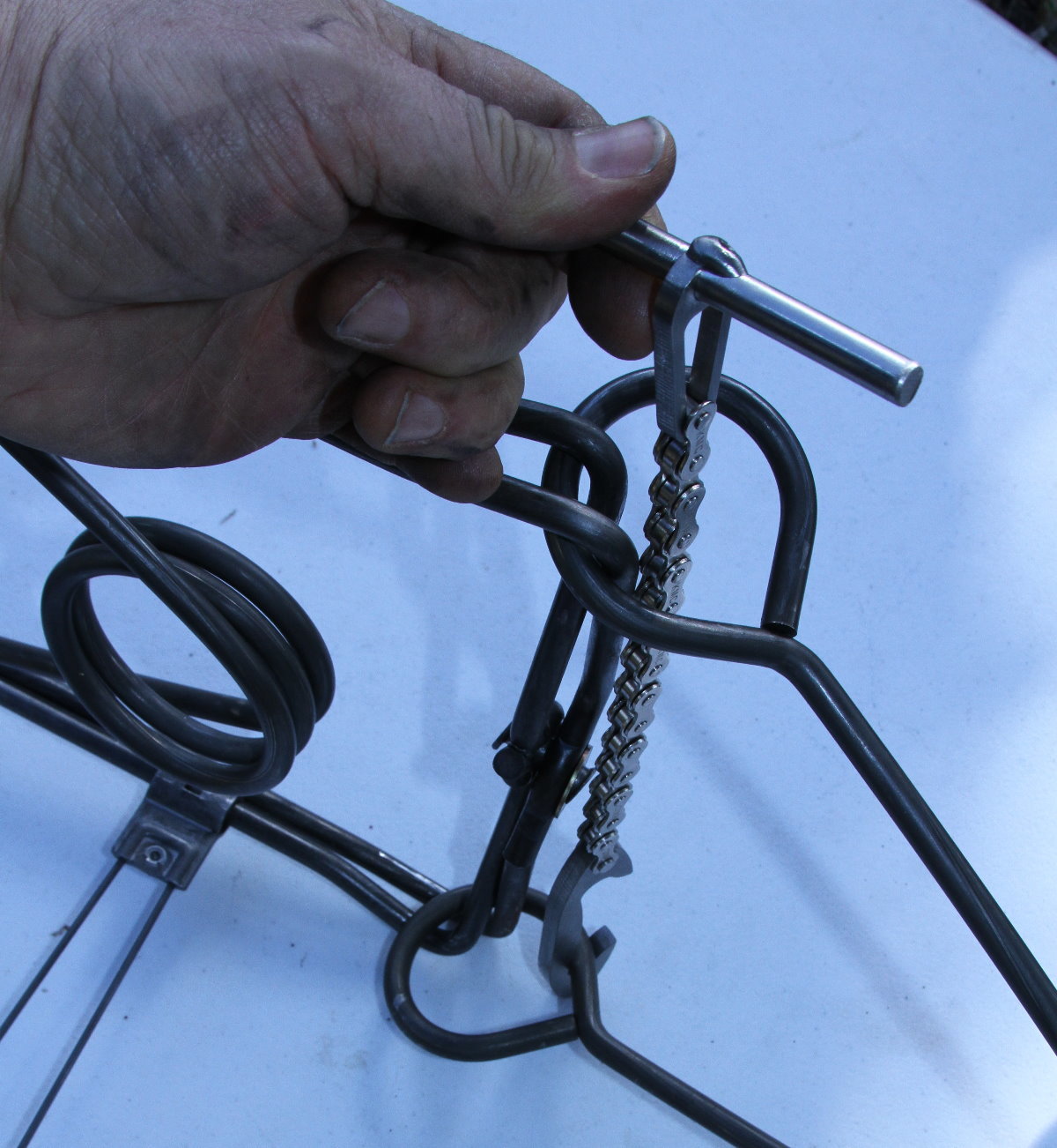 There are a couple other considerations. The first is anchoring the trap. In the pictures you will see what are called disposable anchors. They are a plate connected to a cable, and you drive the plate into the ground about 18″. When you pull back up on the wire, the anchor gets sideways in the hole, and grips solid. Most likely a decent sized hog will tear one out, but not many other animals would, and don’t forget, the goal is the kill the animal when the trap snaps with a Conibear, so it is just as much so that coyotes won’t carry off your animal as it is about holding the animal down. If you expect large hogs, it might be smart to just use a large chain and linkage connected to the trap. Use your better judgement.