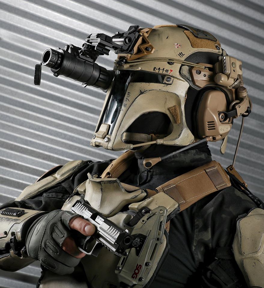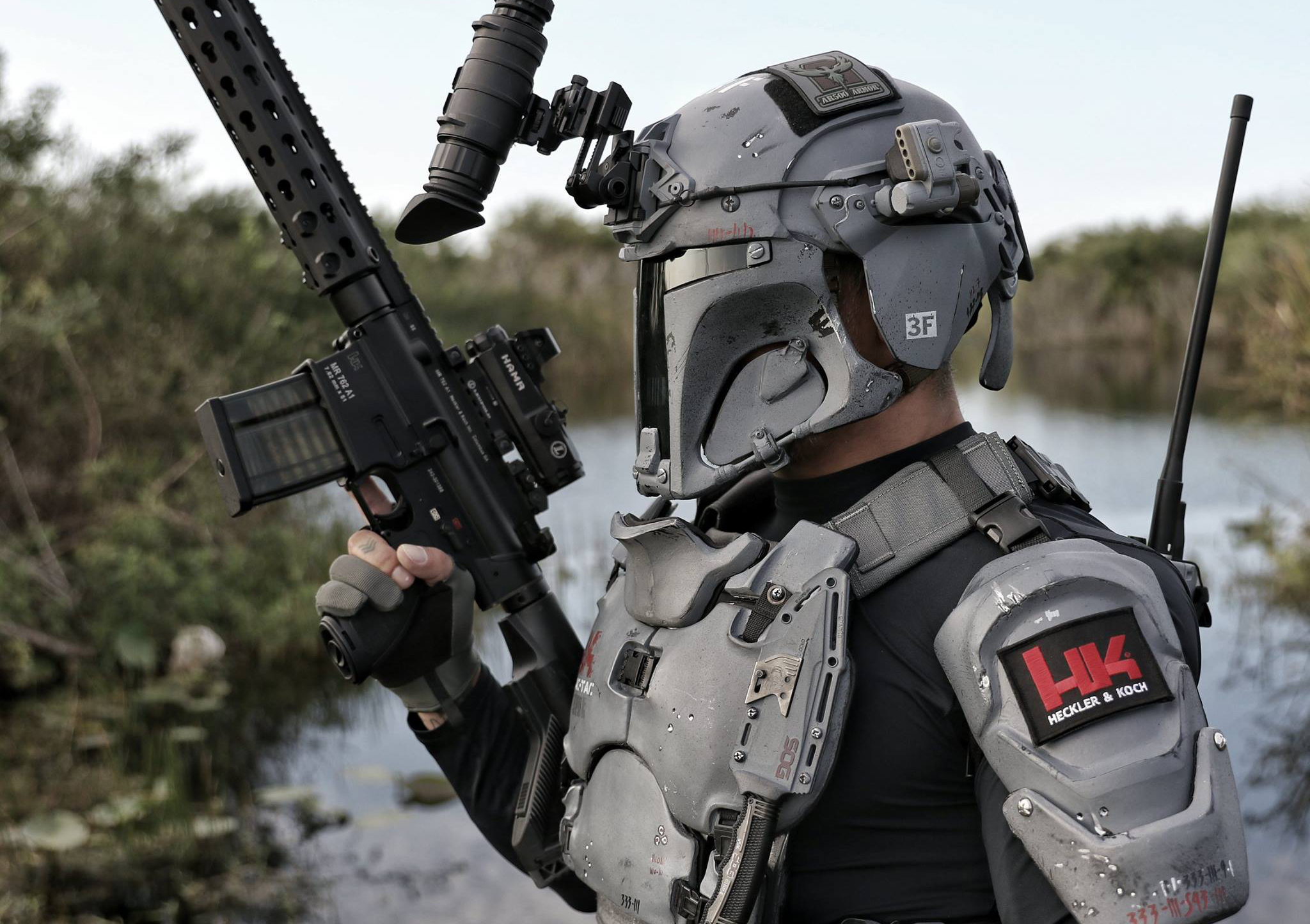 Backed by real-world military hardware manufacturers like AR500 Armor, Armasight, Heckler & Koch, Leupold, SOG Knives, the Galac-Tac Project was the highlight of events and trade shows at the top of the year. The showcase armor suits, one gray, the other tan, were made with functional armor plates, networked night vision optics and other real gunfighter equipment, making the whole thing that much more bad-ass.